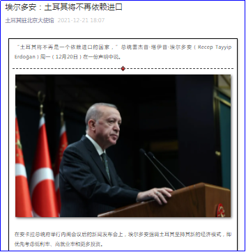 据“土耳其驻北京大使馆”微信公众号消息,土耳其总统雷杰普·塔伊普·埃尔多安(Recep Tayyip Erdoğan)周一(12月20日)在一份声明中说:“土耳其将不再是一个依赖进口的国家。”